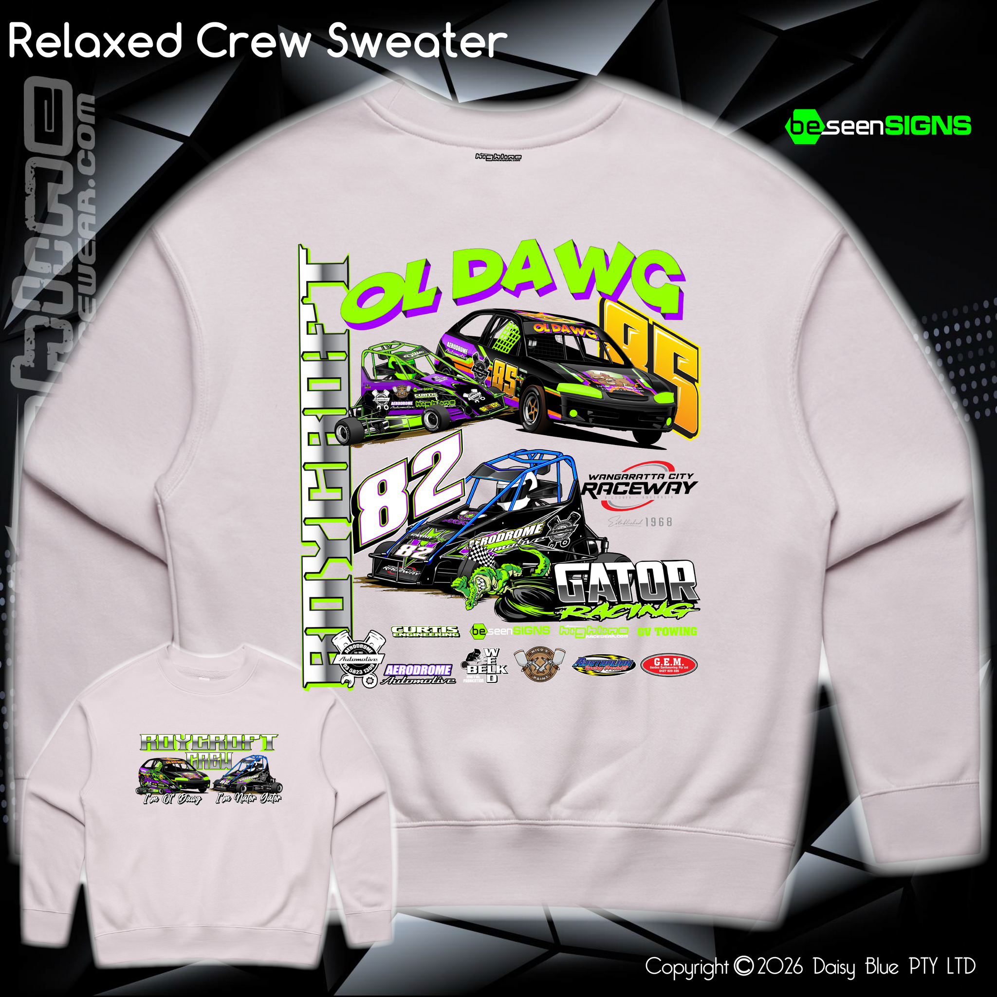 Construction: Pullover crew, drop shoulder, crew neck, sleeve cuff ribbing